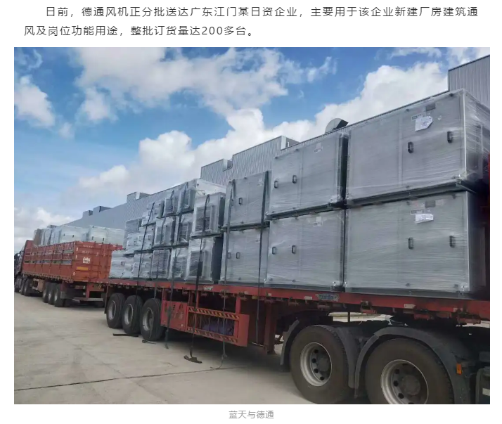 3. 日前,德通風(fēng)機(jī)正分批送達(dá)廣東江門某日資企業(yè),主要用于該企業(yè)新建廠房建筑通風(fēng)及崗位功能用途,整批訂貨量達(dá)200多臺。...