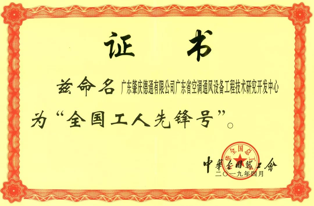德通工程技術(shù)研究開發(fā)中心繼2008年獲得肇慶市“工人先鋒號”、2009年獲得廣東省“工人先鋒號”后,在2019年的4月,又獲評為全國“工人先鋒號”。