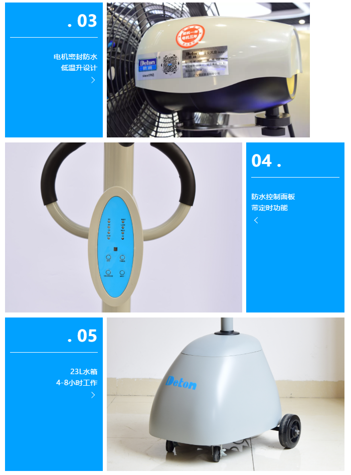 德通霧化降溫風扇,通過離心式霧化,將水珠打散成微米級直徑的細膩霧粒,增大與空氣的接觸面積,通過水分蒸發(fā)帶走空氣中大部分熱量,從而達到降溫的效果。