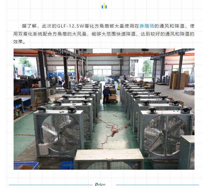 海外市場(chǎng)部的同事介紹,該客戶(hù)近年在德通的推薦下零散訂購(gòu)了一些GLF豪華方角扇和GLF霧化方角扇用于自己的倉(cāng)庫(kù)和車(chē)間通風(fēng)降溫。