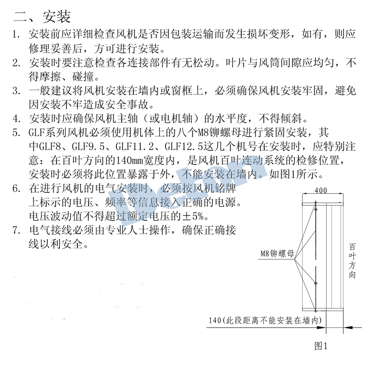 注意事項:風(fēng)機安裝時應(yīng)注意風(fēng)機的水平位置,調(diào)整到風(fēng)機與地面水平穩(wěn)固。安裝后電機不可有傾斜現(xiàn)象