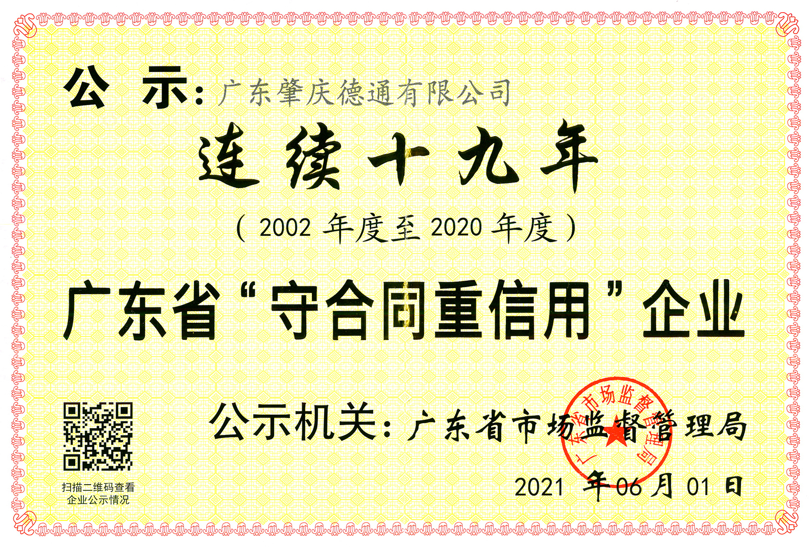 德通公司建立了健全的質(zhì)量保證體系,于1999年通過了ISO9001國(guó)際質(zhì)量管理體系認(rèn)證,多項(xiàng)風(fēng)機(jī)、風(fēng)扇產(chǎn)品通過了CE、CB、ROHS、ERP、GS、UL、AMCA、SASO、SAA、S-mark、PAI、CCC等認(rèn)證。并在近期再獲廣東省“守合同重信用企業(yè)”榮譽(yù)稱號(hào),這是德通公司連續(xù)19年(2002-2020年度)獲得此殊榮。